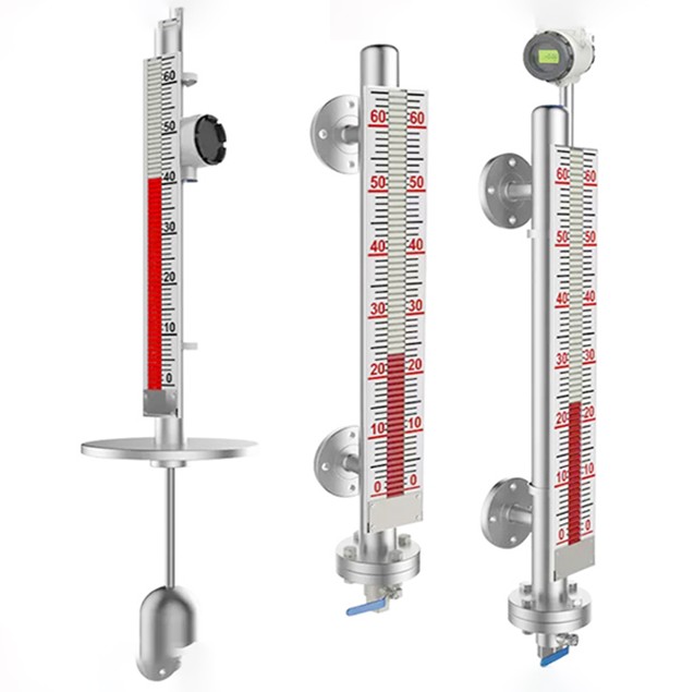 以浮子内磁钢驱动双色薄片的翻转来指示液位的一种新型仪表。磁翻板液位计的主体内磁浮子随液位的升降而上下运动,同时驱使主体外指示器内的双色薄片翻转,有液位时转示红色、无液位时转示白色。红色和白色色带间的界线即代表液位高度。在指示器左侧配有醒目的刻度标尺。从而使液位的指示显得更加清晰